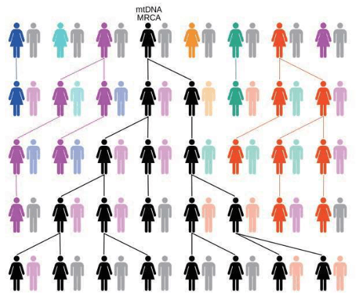宗族母亲(宗族母亲必须有两个女儿,而不是一个女儿。母系祖先是这8个女人最晚近的共同祖先——她的母亲当然也是此后所有女人的母系祖先,但她母亲不是最晚近的,她本人才是。她的两个女儿也是后继的女人的母系祖先,但没有一个是所有这8个女人的共同母系祖先。也就是说,如果将上图视为一个宗族,只有标为MRCA的这个女人是宗族母亲。不论8个人还是800万人的宗族都适用这同一原则(MRCA,Most Recent Common Ancestor:最晚近的共同先祖))