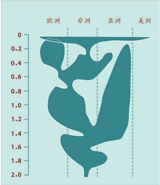 如果群体的增长是停滞的或者缩减的,这个分布会呈现“来回拉锯”的形态,原因是遗传漂变(genetic drift)或自然选择导致某些血统的绝嗣和丧失。如果这种分布形态是平滑的,表示我们现代智人的人口增长速率很高。哈本丁和他的团队采集和分析了世界25个群体的线粒体DNA数据,发现呈现指数增长的群体多达23个。根据这一研究成果,他出版了一本著作《一万年的爆炸》(The 10000 Year Explosion)。亨利·哈本丁认为,这场人口大迁移起始于5万年前,这个时间与人类走出非洲的时间基本吻合。