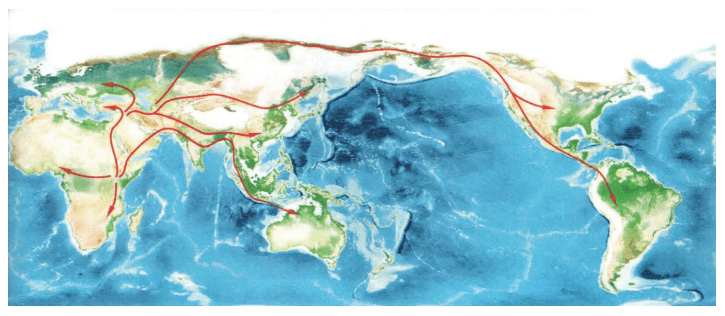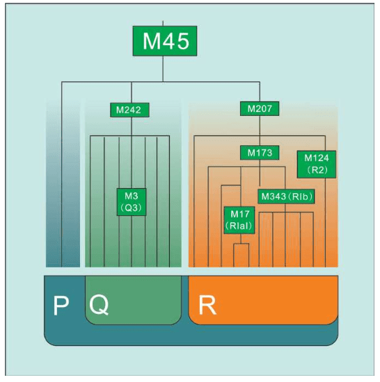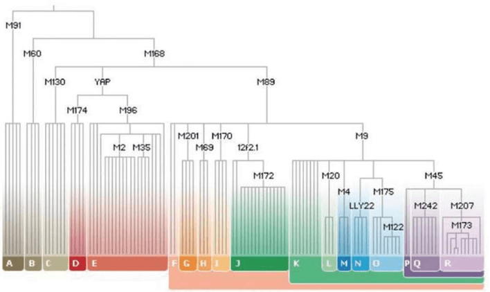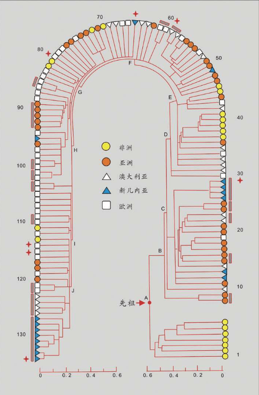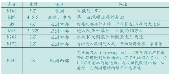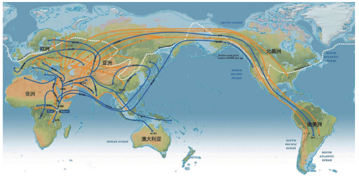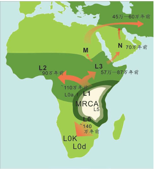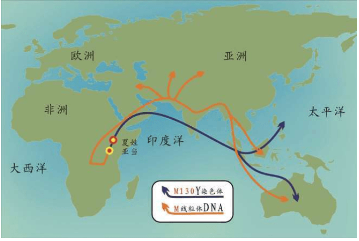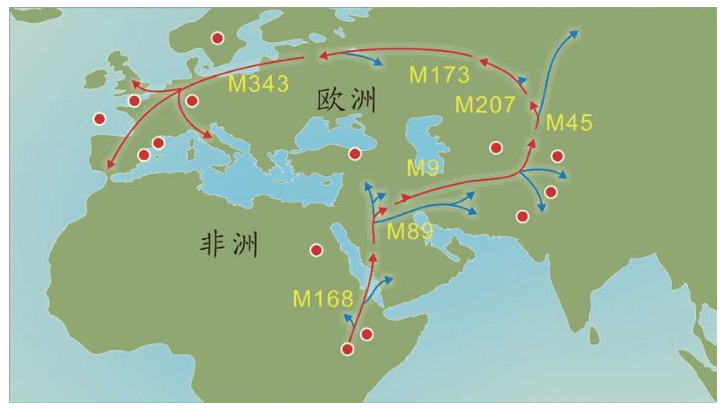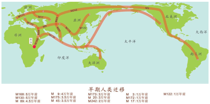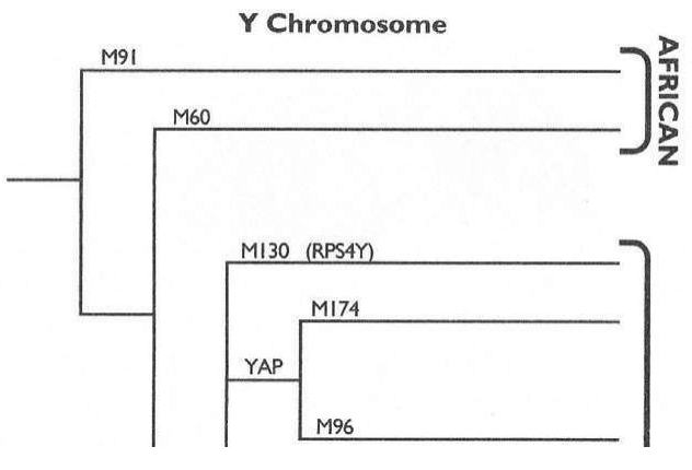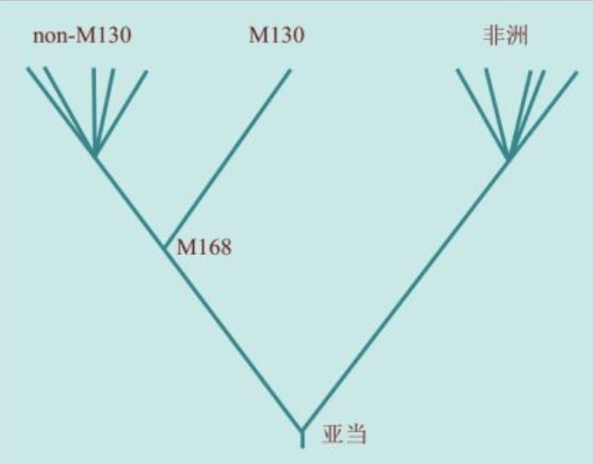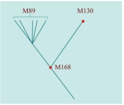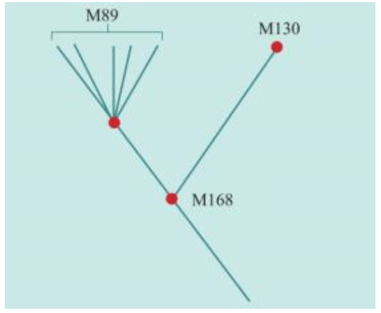 M 168重要的后裔也有3个人,即M130、YAP和M89。约6万年前,第一批走出非洲的人类是M168的后裔M130。一部分M130沿着海岸线一直走到澳大利亚,还有一些M130留在印度次大陆——东南亚地区,他们继续北上进入亚洲的东部,即青藏高原——中国内地——蒙古——韩国——日本等地,还有一些人进入了北美洲。
