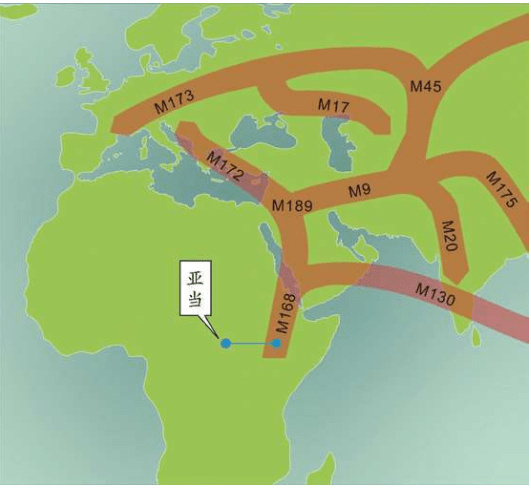M168又被称为“欧亚大陆亚当”(Eurasian Adam)或“走出非洲亚当”(Out of Africe Adam),这个男人的Y染色体突变发生的时间为6万——7.9万年前,地点在东非的埃塞俄比亚——苏丹一带。我们不知道M168是什么人,有些学者认为他“可能是一夫多妻制度下的一位酋长”。走出非洲的男性并非只有M168的后裔,但是M168是迄今为止唯一没有断绝的男性Y染色体血统。