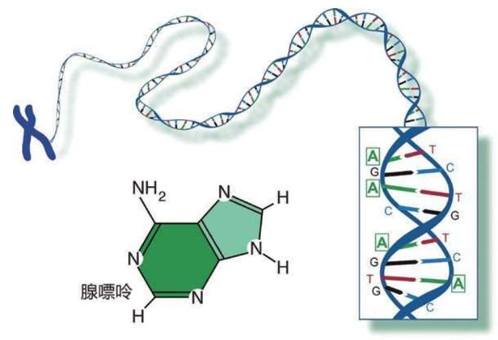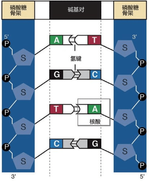 但是,DNA的这些X射线的照片的形态太奇特了,他们两人很久都没有找到与之相吻合的DNA化学结构。最后,沃森和克里克采用了非常笨拙的“原始”方法,用一条一条的硬纸板和一片一片的金属片和金属丝,构建各式各样的模型,试图重现DNA的结构。他们最后发现有一种双螺旋模型完全吻合X射线的分布。这种模型很简单,像两个螺旋形的梯子扭结在一起。而且这种结构非常稳定——只有稳定的结构才能作为遗传物质。DNA正是一种极其稳定的化学结构,仅由4种核苷酸碱基构成的一种糖类骨架。这4种核苷酸的化学名称如下: A 腺嘌呤 C 胞嘧啶 G 鸟嘌呤 T 胸腺嘧啶